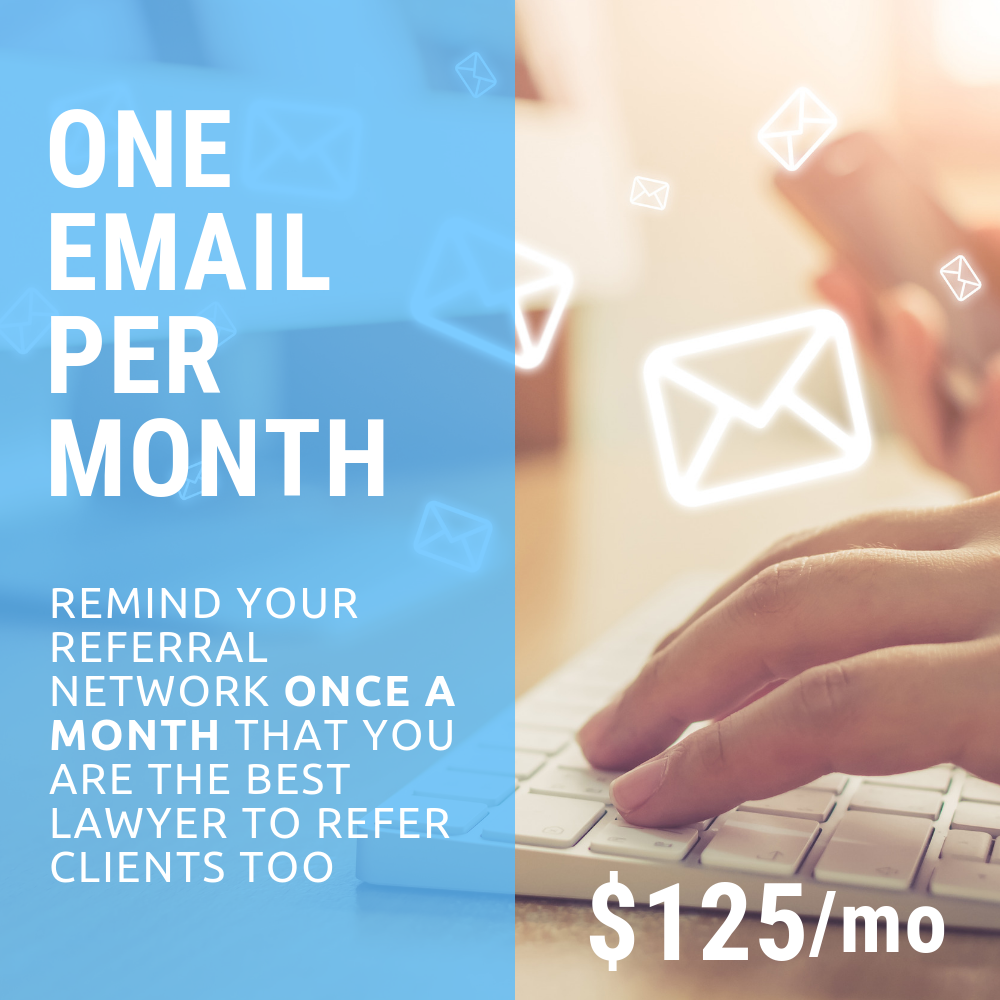 We send email newsletters on your behalf to your referral network. These newsletters keep you on the top of everyone’s mind. That way, the next time someone in your network has a referral in your practice area, you are the first lawyer that they think about.